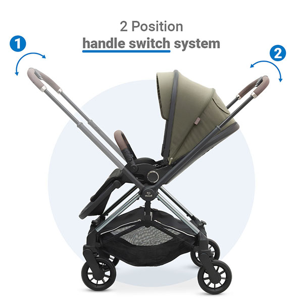 Μεταφερόμενο χερούλι: Μια καινοτομία που θα λατρέψετε! Μεταφέρετε το χερούλι στην αντίθετη πλευρά του καροτσιού με μια απλή κίνηση και απολαύστε την οπτική επαφή με το μωρό σας, χωρίς να χρειάζεται να διακόψετε τη βόλτα σας.