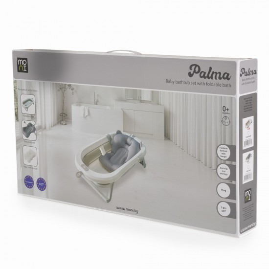 Το σετ μπάνιου για μωρά Palma Moni, περιλαμβάνει μια πτυσσόμενη μπανιέρα, ένα μαλακό μαξιλάρι μπάνιου (43x33 cm) και ένα σφουγγάρι.