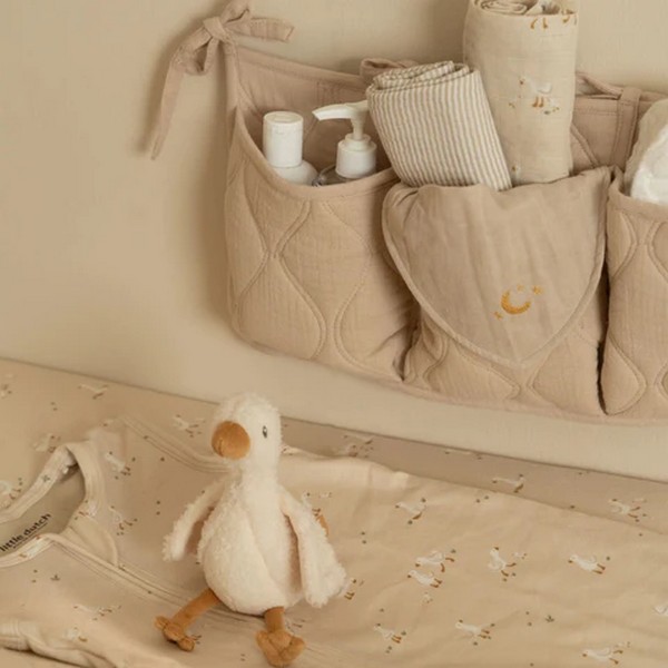 Φτιαγμένες από 100% οργανικό βαμβάκι, διαθέτουν τρεις ευρύχωρες τσέπες, ιδανικές για να αποθηκεύσετε πιπίλες, σαλιάρες, πάνες, μωρομάντηλα, παιχνίδια και άλλα – δηλαδή όλα όσα χρειάζεστε για τη φροντίδα του μικρού σας. Προσαρμόζονται εύκολα στο πάρκο, στην αλλαξιέρα ή στον τοίχο, με τα πρακτικά σχοινάκια.