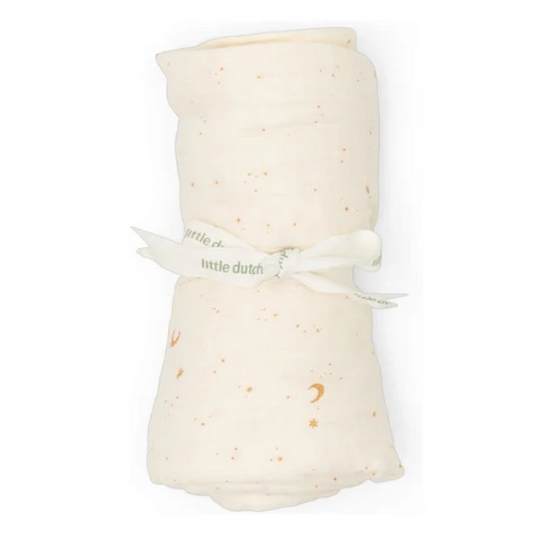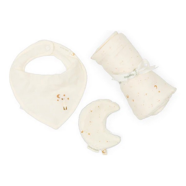 Μέσα θα βρείτε τρία απαραίτητα για κάθε γονιό: ένα απαλό πανάκι μουσελίνας, ένα πρακτικό ντουντού με το παιχνιδιάρικο σχέδιο Moon & Stars και μια χαριτωμένη σαλιάρα σε απαλή απόχρωση με κομψό κέντημα.