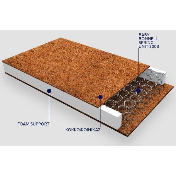 Τα ελατήρια BABY BONNELL SPRING UNIT 200B προσφέρουν εξαιρετική αντοχή, ενώ η στρώση από κοκκοφοίνικα προσφέρει ελαστικότητα και επιτρέπει την κυκλοφορία του αέρα στο εσωτερικό του στρώματος. Επιπλέον, το αφρώδες υλικό ενισχυμένης πυκνότητας Foam support υποστηρίζει περιμετρικά το στρώμα. Ένας άνετος και υγιεινός ύπνος για το μωρό σας!