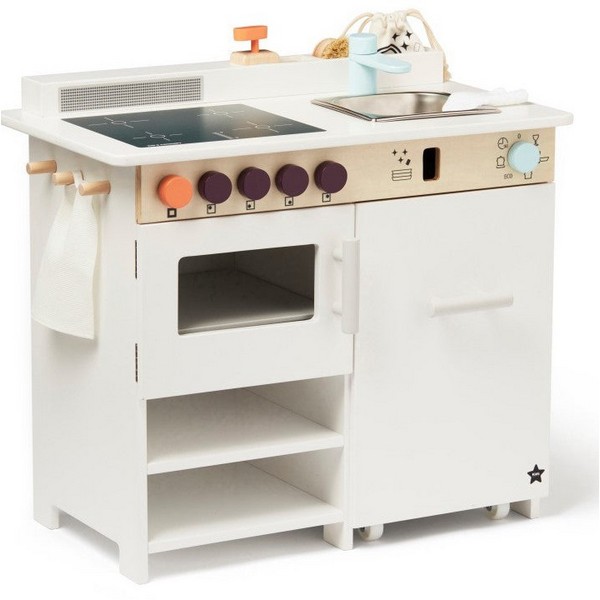 Είναι εύκολα προσβάσιμη για τους μικρούς σεφ, καθώς υπάρχουν ράφια κάτω από το φούρνο για να αποθηκεύσεις τα τηγάνια και τις κατσαρόλες. Όταν τελειώσει το πάρτυ βάλε τα άπλυτα στο πλυντήριο πιάτων. Για τις δύσκολες βρωμιές υπάρχει σφουγγάρι και σαπούνι.
