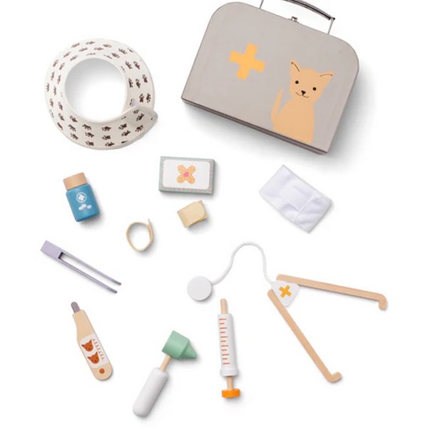 - Συμπεριλαμβάνει ωτοσκόπιο, σύριγγα, μπουκαλάκι με φάρμακο και τροφή για γάτες, στηθοσκόπιο, θερμόμετρο, τσιμπιδάκι και κολάρο ανάρρωσης από ύφασμα.