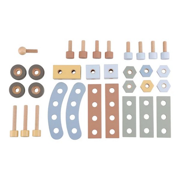 Έρχεται με ένα σετ 55 εξαρτημάτων που περιλαμβάνει παξιμάδια και μπουλόνια, βίδες, πάνελ, τροχούς και βασικά εργαλεία όπως σφυρί, πριόνι, κατσαβίδι, χάρακα και κλειδί. Ο στιβαρός ξύλινος πάγκος εργασίας σε μοντέρνα χρώματα δημιουργεί έναν υπέροχο χώρο παιχνιδιού στο παιδικό δωμάτιο, αλλά θα φαίνεται υπέροχος και σε ένα σαλόνι.