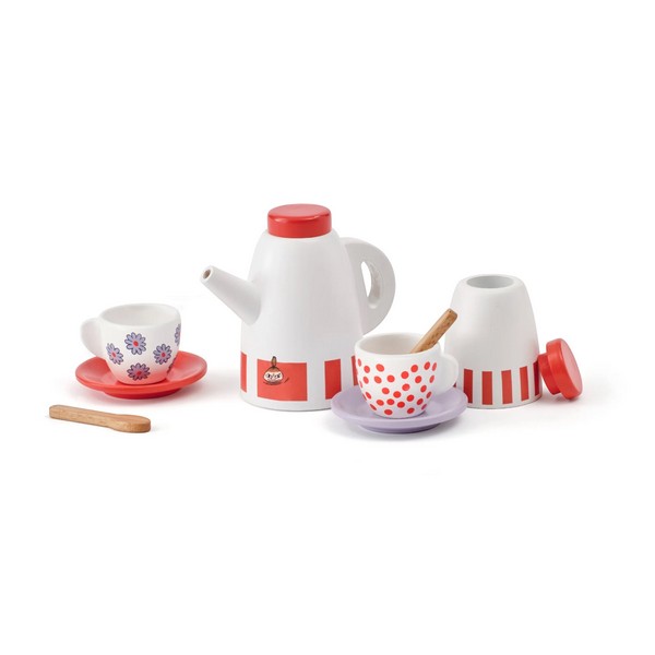 Το σετ περιλαμβάνει δύο ξύλινα φλιτζάνια με πιατάκια, δύο κουταλάκια, μια κανάτα για καφέ και ένα μικρό βαζάκι που μπορεί να χρησιμοποιηθεί είτε για κρέμα είτε για ζάχαρη.