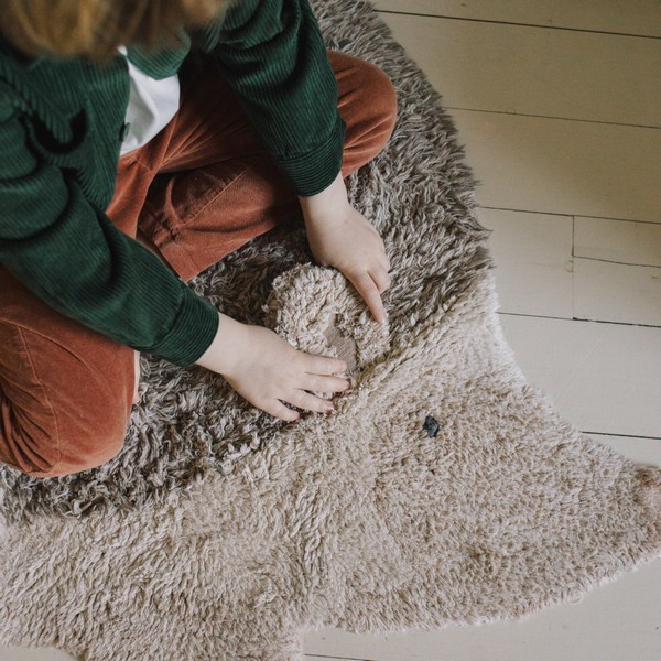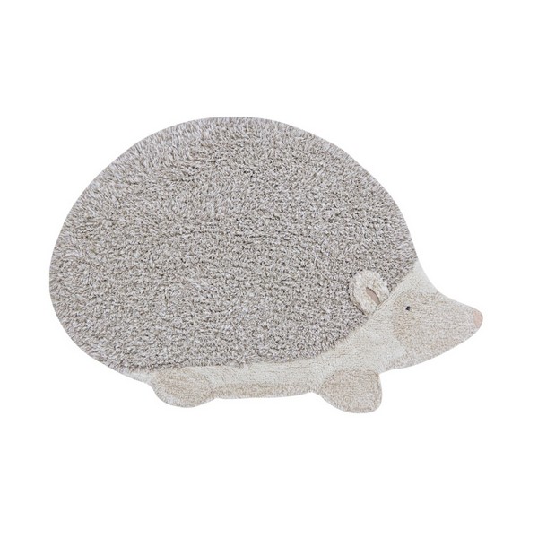 Ένα χειροποίητο βαμβακερό χαλί σε σχήμα σκαντζόχοιρου με φυσικά και ανοιχτά καφέ χρώματα, με μακρύ πέλος και χνουδωτή υφή που προσομοιάζει τα αγκάθια του σκαντζόχοιρου.
