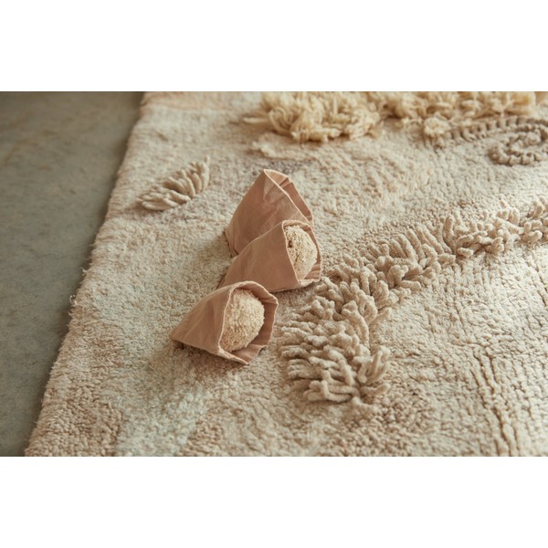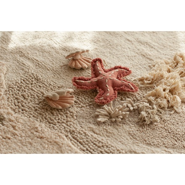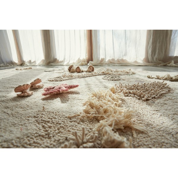 Το χαλί Βυθός είναι ένα ονειρεμένο χαλί για παιχνίδι, με διαφορετικά στοιχεία εμπνευσμένα από ένα μαγικό υποθαλάσσιο σκηνικό, που κατοικείται από αστερίες και κοχύλια που κρύβουν μαργαριτάρια.