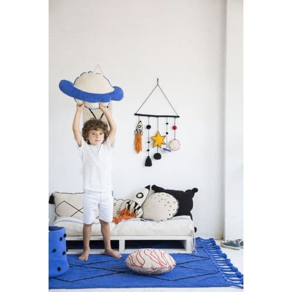 Εμπνευσμένο από τον πλανήτη Κρόνο, ένα ξεχωριστό μαξιλάρι με μια πανέμορφη μπλε λωρίδα από βαμβάκι, που αναπαριστά τους δακτυλίους του Κρόνου. Χειροποίητο με κάλυμμα από 100% φυσικό βαμβάκι, γέμιση από 100% πολυεστέρα, και μη τοξικές βαφές. Πλένεται εύκολα στο πλυντήριο χωρίς να χρειάζεται να αφαιρεθεί το κάλυμμά του, καθώς δε διαθέτει φερμουάρ ή κουμπιά, γεγονός που το καθιστά απόλυτα φιλικό προς τα παιδιά. Αυτό το προϊόν πληροί όλες τις προδιαγραφές ποιότητας και ασφάλειας για τα παιδιά, ενώ έχει ISO 9001, ISO 14001, ISO 18001 και πιστοποιητικά AITEX. Διαστάσεις 40 x 60 εκ.