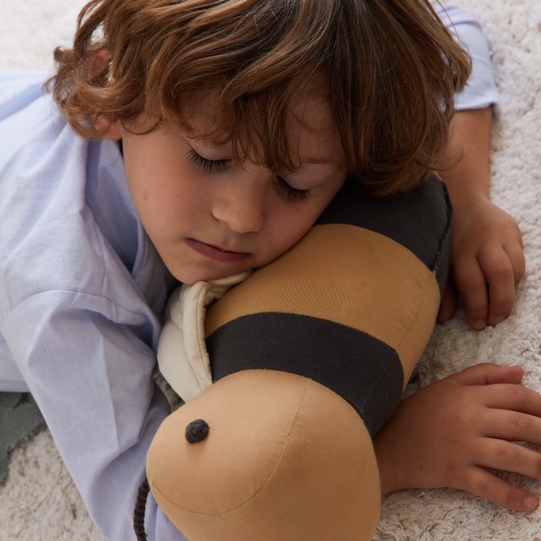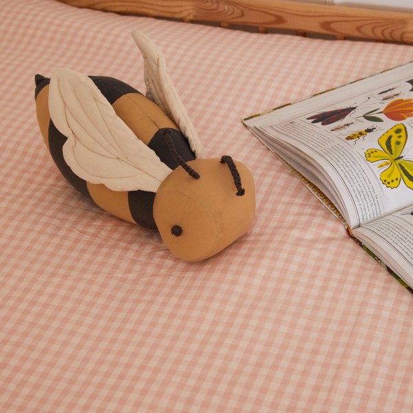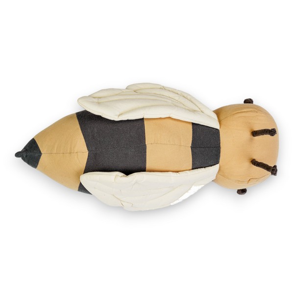Αυτό το ευφάνταστο μαξιλάρι σε σχήμα μέλισσας είναι κατασκευασμένο από μαλακή βαμβακερή ποπλίνα στο χρώμα του μελιού, διακοσμημένη με παιχνιδιάρικα κομμάτια από σκούρες γκρι ρίγες και μαλακά παραγεμισμένα φτερά σε φυσικό χρώμα.